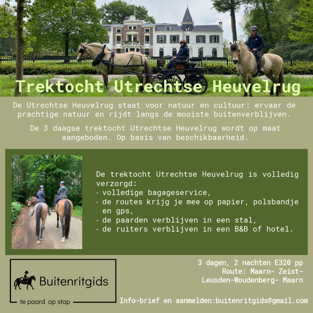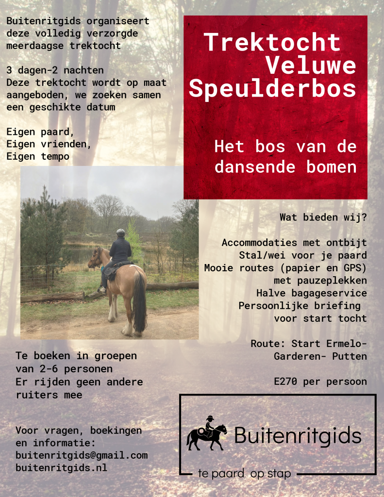 Ervaar een unieke meerdaagse tocht te paard: 3 dagen, 2 nachten vol natuur, rust en vrijheid. Je rijdt deze trektocht met je eigen paard en bepaalt zelf je tempo – volledig zelfstandig, met de zekerheid van een goed voorbereide route.