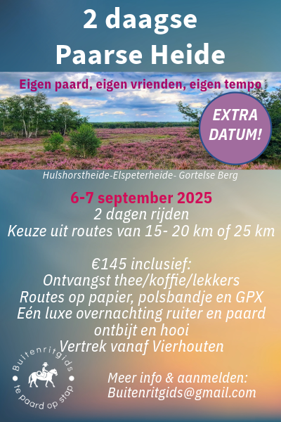 Paarse Heide 2 daagse 30-31 aug & 6-7 sept 2025 admin 09/03/2025 Uncategorized 2 reacties Bericht navigatie Volgende Volgend bericht: Ponykamp voor volwassenen 27-30 juni 2025 2 reacties Senna 26/04/2025 om 22:36 Beantwoorden Ik zou graag met mijn paint, en met een vriendin met haar paard samen deze tocht willen maken! Is dat mogenlijk? admin Bericht auteur 14/05/2025 om 18:05 Beantwoorden Hoi Senna, Helaas zit dit weekend al vol. Zou je op de mailinglihst willen? Dan krijg je de volgende keer voorrang bij inschrijven. Kijk ook bij mijn andere weekenden en dagritten. Er zit vanalles tussen en er komt binnenkort nog meer aan. Doei bonny Geef een reactie Reactie annulerenJe e-mailadres wordt niet gepubliceerd. Vereiste velden zijn gemarkeerd met *Reactie * Naam * E-mail * Site Mijn naam, e-mail en site opslaan in deze browser voor de volgende keer wanneer ik een reactie plaats. Δ